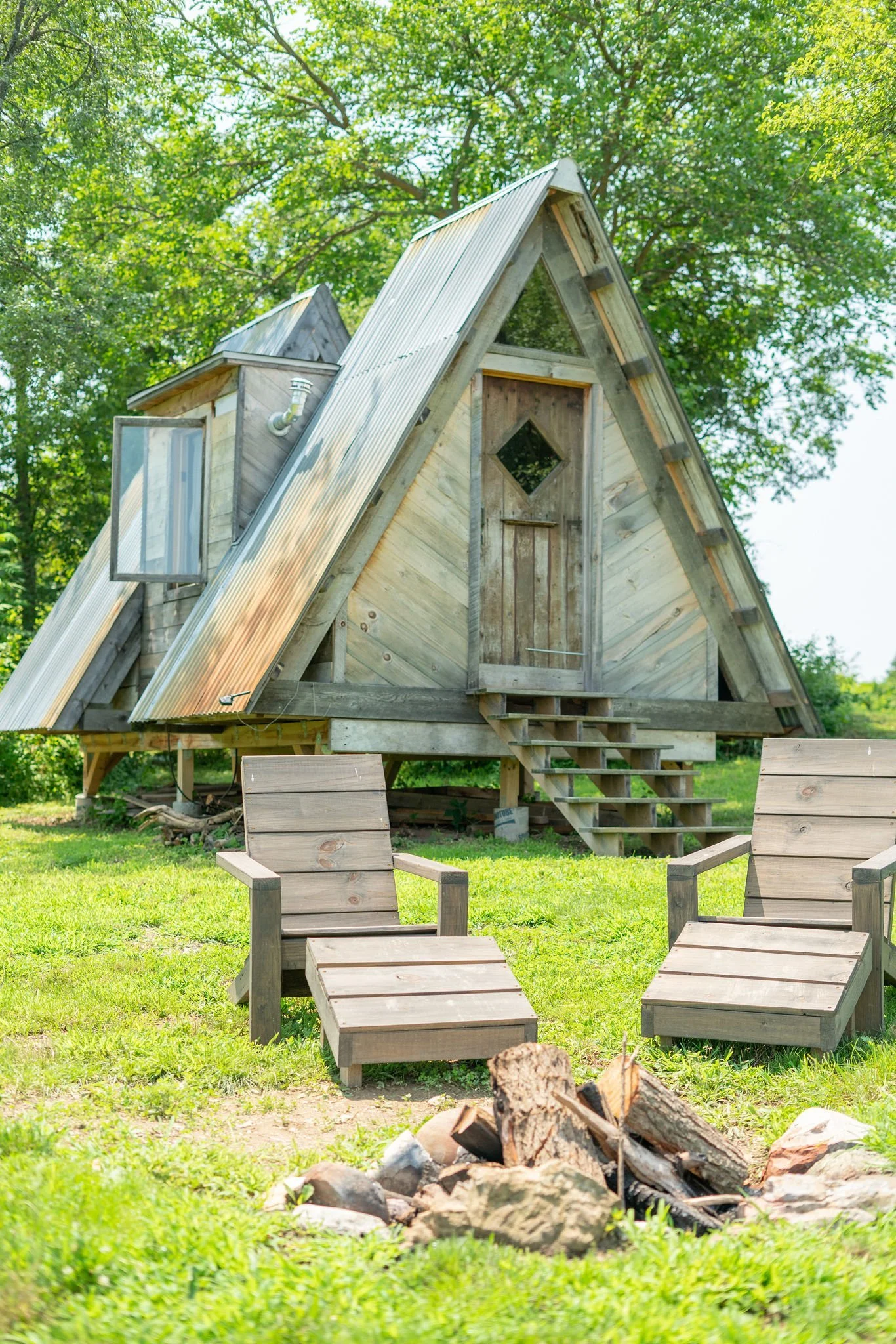 This artist designed and made cabin is both modern & rustic in architecture and sure to win your heart and visual desires. It is perfect for 2 or a small family of 3 and hosts a queen size bed. It is private yet conveniently located near a brand new stunning bathhouse. The A-Frame has a rooftop deck where you can look out over the landscape, a private picnic table, firepit, and Adirondack chairs. It is also the only cabin to boast AC on the property, and electricity for needs beyond lighting.